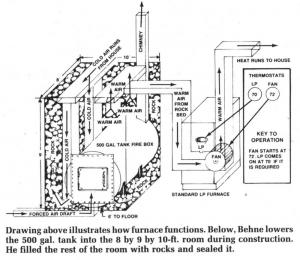 The unique set-up allows him to fire his home-built furnace with wood for 4 to 5 hours at night and store enough heat in the rocks to last for two days when outside temperature is 20º. When it's 0º (and depending on wind chill) Behne notes that he needs to fire the wood furnace once a day to keep the LP furnace from kicking in.