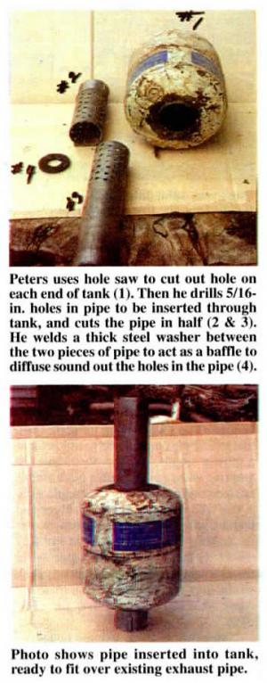 To make a muffler, Peters cuts the shutoff valve off a tank, then uses a hole saw to cut out a hole on each end of the tank that's about 1/4 in.; smaller than the vehicle's exhaust pipe. He uses a pliers to flare the holes out about 1/8 in. The 1/8-in. wide flange makes it easy to weld the pipe in place. Then he takes a piece of pipe long enough to run through the tank and drills it full of 5/16 or 1/4-in. dia. holes. He leaves about 1 in. of pipe free of holes in the center. That's where he cuts the pipe in half and then welds a 1/ 8-in. thick steel washer between the two halves. The washer has a 3/4-in. dia. hole at center. It acts as a baffle, diffusing sound out the holes in the pipe into the tank.
