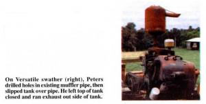 Another way to use freon tanks as mufflers is to drill holes in the existing muffler pipe, and then slip the tank over the pipe so it covers the holes. Peters used this method on his Versatile 103 swather, running the exhaust out the side of the tank.