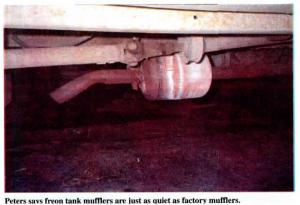Peters gets small freon tanks for nothing from dumps and from garages that use them to fill air conditioners. "The first one took a while to make, but after that it was easy," says Peters. "Commercial mufflers generally sell for $30 to $60 or more. I made my first freon tank muffler 6 or 8 years ago for my 1960 IH 151 combine and it's still on there. I've also made them for my Versatile 103 swather and IH 715 combine, as well as a 1969 1-ton truck and a 1968 2-ton truck. They're just as quiet as factory mufflers, and quieter than some, and they don't throb or drone like some commercial ones."