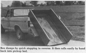 The dump box is simply a wood-framed plywood box on rollers built to fit just inside the pickup box. It's strong enough to haul dirt, gravel, wood or any other material. To unload, you simply park 10 to 12 ft. in front of the desired unloading area and lower the tailgate. Then back up quickly and apply the brakes. A pair of heavy nylon straps keeps the box close to the back of the truck. Pull forward a few feet to empty the box and then roll it back into the back of the pickup by hand.