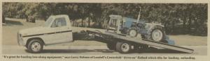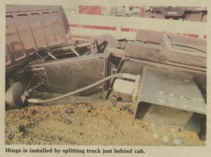On the road, a Landoll-equipped truck looks like any other pickup flatbed, except for it's not-so-common all-aluminum construction. But, when it stops to take on a load, it becomes one of the most unusual vehicles around. First, the Landoll hinge ù installed by spritting the truck chassis in half just behind the cab ù is activated. A hydraulic cylinder opens a hinging mechanism that tips both the cab and front of the flatbed up into the air. It tips up about 2 ft., which points the flatbed toward the ground. At this point, a second cylinder under the bed is activated and slides the bed down till it contacts the ground.