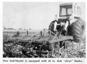 Weighing more than 460 lbs. per foot of machine width, the Soil-Master digs deep to break up hard pan. It's 20 in. dia. coulters, spaced every 7 1/2 in., permit virtually "plug free" tillage in the fall or early spring. Curved helical chisle blades, with 4 in. moldboard, incorporate approximately 75% of the crop residue within the top 8 in. of soil.