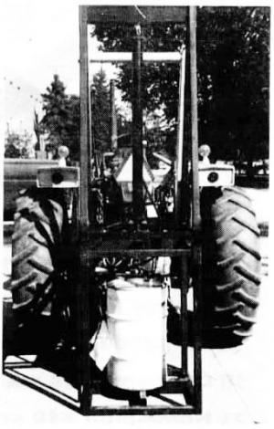 The barrel crusher mounts on a tractor 3-pt. and consists of a 3-in. cyl. with a 36-in. stroke anchored in a frame made from square steel tubing. The barrel sits on a metal base and is flattened by a cross-shaped crusher mounted on the hydraulic piston. It'll crush barrels up to 35 in. tall.