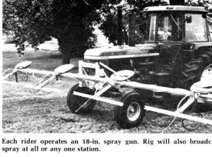Broadcast spraying is also possible with this "fastest new spray gun in the West". Operators flip a quarterturn valve to broadcast-spray a heavily-infested area, then resume spot spraying in areas of sparser infestation. Eight 40-in. rows, or twelve 30-in. rows, can be sprayed broadcast. If the crop needs cultivating, a rear mounted cultivator can be used behind the tractor, with riders up front to spot spray isolated weeds. Or, the driver can broadcast spray with or without riders as he cultivates.