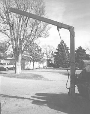 Simple 3-Pt Lift Hoist IRRIGATION Acessories 20-3-7 "There are a couple portable hoists on the market that offer as much clearance as mine, but they're expensive. This one cost virtu-ally nothing to build," says Harold Witulski of Beatrice, Neb., about his high-reach, 3-pt. mountable lift hoist for working on center pivots.
