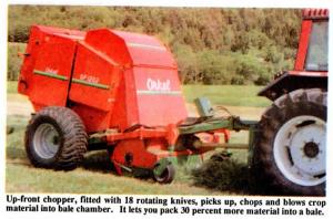 The Norwegian-built OrkelGP 1202 baler is being imported to the U.S. and Canada by Norse Products, Winnipeg, Manitoba. It uses 18 rotating knives to pick up, chop and blow the crop up a chute and into the bale chamber. It produces bales that are on average 30 percent denser than conventional round bales. That means there's less air in the bales, which speeds the silage making process (if you wrap bales), and reduces baling, wrapping, and handling costs because you end up with fewer bales.