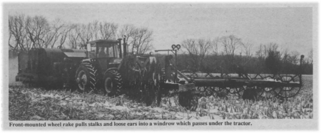 The huge machine -- it measures 75 ft. from front to back -- is powered by a 160-hp tractor and carries its own 160-hp diesel engine as well. A front-mount wheel rake pulls in a 25-ft. swath, raking all stalks and loose ears into a windrow that passes under the tractor. The specially-built, variable width rake has rubber-mounted teeth that rake in the ears of corn.