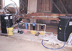 The first step is to pour a 5-gal. can of diesel fuel into the mixing barrel. To make a 3:1 mix he then pumps in 15 gal. of waste oil. Using a 3-ft. long paint mixer attached to a portable drill, he mixes the oil and diesel for about three minutes. Then he puts the lid back on the barrel, opens a pair of valves, and turns on the 12-volt pump to send the mixture through the filters and into the 55-gal. "fill" barrel.