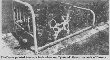 The Deans painted two twin beds white and "planted" them over beds of pansies, petunias and roses. There's one bed on either side of the driveway.