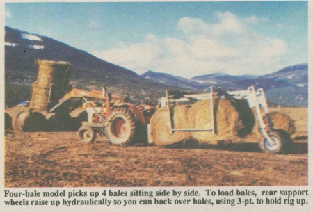 Vickaryous has also built a 2-bale model without rear support wheels. Two sets of hydraulic outlets are needed for the 4-bale model and one set for the 2-bale model. The arms on both models can be adjusted to handle 5 by 5 or 5 by 6-ft. round bales, or 4 by 5-ft. sq. bales.
