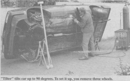 "It's better than an overhead hoist because it lets you work in a comfortable position," says Robert Baker, U.S. distributor of the German-built "tilter". The device consists simply of three parts: Two rocker cradles and a rolling lift mechanism that's powered by a 1/2-in. electric drill. You can use the "tiller" on any level surface and it'll tilt a car up to 90 degrees (it's recommended you go no further than 80 degrees with a pickup because they're more top heavy).