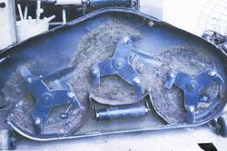 Walter Murray replaced the blades on his 30-year-old Deere 214 47-in. riding mower with cutting discs fitted with three swivel-mounted blades.