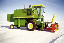 "It's quite an attention getter, but it's also a very practical machine for blowing snow," says Heyduk, who made the conversion a year ago. "I really enjoy sitting in the combine's nice, warm heated cab and also being able to look ahead instead of back while blowing snow. I'm up in the air where I can see real well. I didn't alter the snowblower at all, so it takes only a few minutes to remove it from the combine and hook it up to a tractor. My friend Val Jaspers manufactured the shafts and mounted the gearbox for me. The 3-pt. hitch on the feederhouse lets me drive into the snowblower and hook it up just like I would back into it with a tractor.