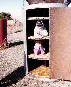 Thomas Strasburger built it out of a 500-gal. fuel tank. He cut a rectangular-shaped opening into one side and hinged it to make a door. Then he installed four rotating "Lazy Susan"-type shelves which he made out of rake wheels covered by pieces of particle board. The wheels mount on a shaft that runs down the center of the tank.