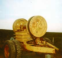Trantham mounted the crushing components on a semi tractor frame cut down to 6 ft. long and fitted with dual wheels.