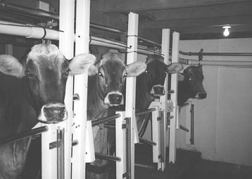 You won't find an easier to maintain milking parlor than the one built by Gary Lisowe, Gillett, Wis., who used "plastic lumber" and stainless steel pipe to put together a 4-unit, walk-through milking parlor. "It was fairly economical to build, but the biggest advantage is that the materials I used will never rot or rust and they clean up like new," says Lisowe, who milks a herd of registered Brown Swiss cows. The stalls were set up on top of a 10-in. high concrete platform. Lisowe bought the stainless steel pipe at an auction held by a farmer who had quit milking cows. He bought the plastic lumber -- which consists of white 4-in. sq. posts -- from a company in Green Bay. The pipe was used to form the sides of the stalls. The posts were used on the corners. They mount on stainless steel plates that bolt to the concrete floor. The pipes were also used to build "catch and release" gates at the front of each stall. Each gate is manually opened or closed by pulling on a lever attached to a cable and pulley system. Cows stand "on their honor" during milking without any restraint. Once milking is complete, the operator pulls the lever allowing the cows to step forward and exit the parlor. The operator sits on a 14-in. long, 6-in. wide "swinging stool" also made from plastic lumber. The stool is free to swivel at the end of a 1 1/4-in. dia. galvanized steel pipe. The pipe itself pivots on brackets attached to a vertical steel post. "I set up this parlor four years ago and have used it to milk 30 cows twice a day, which comes out to about 75,000 milkings. I've only had to make minor adjustments and repairs," says Lisowe. "One person can milk up to 30 cows per hour with four milking units, even though they're not equipped with automatic take-offs. The plastic lumber cost about two and a half times as much as wood, but it's worth it because it never rots and never has to be repainted. To attach the pipes to the posts I ran a 3/8-in. dia. threaded steel rod through each pipe and recessed the end of each rod in the sides of the posts."