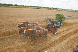 With the help of a Pioneer 74 hp diesel pto forecart, this Model 42 Deere combine is horse-drawn. The four big Belgians easily pull the combine with its 9-ft. header and 42-bu. grain tank around the field, while the cart's hydraulic brakes and hillside steering make handling easy.
