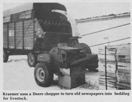 A Deere Model 35 forage chopper turned 3,000 lbs. of newspaper into bedding in about an hour. The only modification of the chopper was replacement of the pick-up tines with a steel chute of newspaper size. The knives and screens were set for a 1-in. cut.