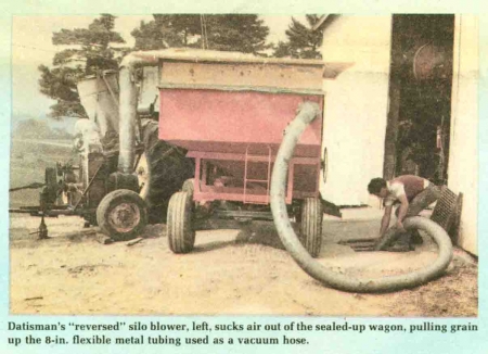 One of the best farm shop ideas we've seen lately is this low-cost grain vacuum that Iowa farmer Roger Datisman, of Sherrill, designed and built, using an old silage blower and his 200 bu. grain wagon.