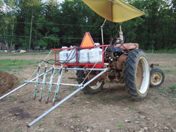 After much research, Sipos gathered angle iron, galvanized water pipes and other materials he had on hand. He purchased scaffold fittings to connect the parts and built a frame to attach to his tractor's 3-pt. hitch. The angle iron frame holds four 20-lb. liquid propane tanks, which are hooked up to four commercially available weed burners. A cross piece on the frame holds the burners about 8 in. off the ground, about 4 ft. behind the LP tanks. Two long water pipes drag behind to maintain an even distance to the ground.